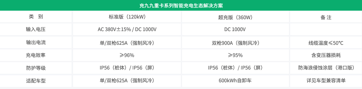 充九九,专为新能源重卡、矿用自卸车、工程特种机械车、绿化环卫特种车、公共交通巴士车、港口AGV等大电量商用车设计,单桩功率覆盖180kw~360kw,实现行业领先补能效率。